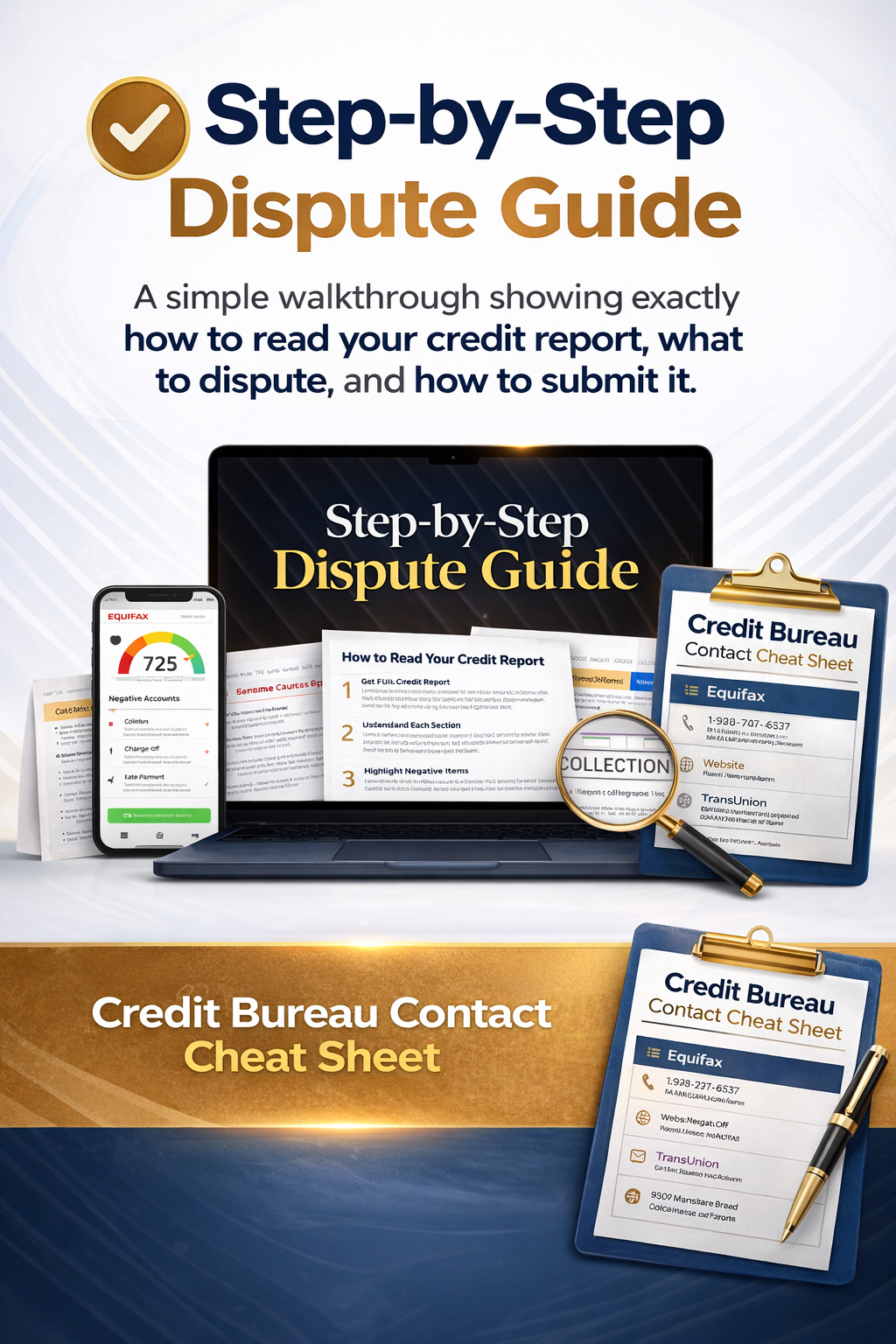 Inside, you’ll get a complete 3-bureau breakdown walkthrough, a simple checklist showing you exactly what to look for, ready-to-use dispute letter templates, and proven strategies to help you start improving your credit score right away.