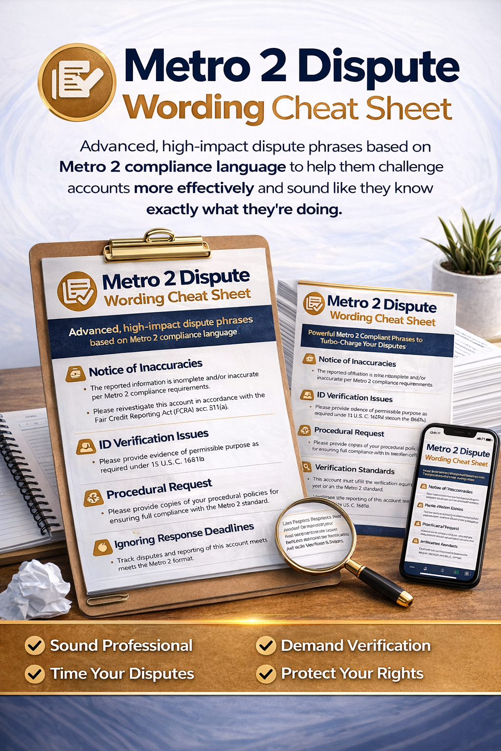 Advanced, high-impact dispute phrases based on Metro 2 compliance language to help them challenge accounts more effectively and sound like they know exactly what they’re doing.